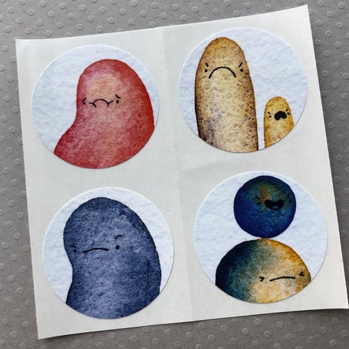 super durable, glossy finish vinyl stickers. each sticker measures 1.5" in diameter, and the original lumpy friends sticker pack, with mostly disgruntled faces ;)